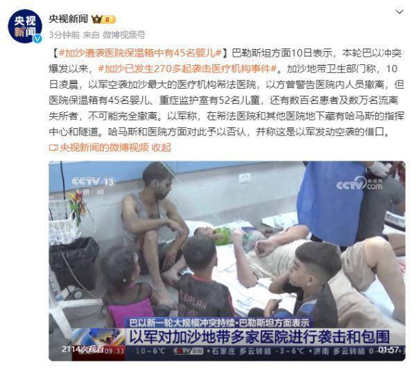 巴勒斯坦方面10日表示,本轮巴以冲突爆发以来,加沙已发生270多起袭击医疗机构事件。加沙地带卫生部门称,10日凌晨,以军空袭加沙最大的医疗机构希法医院,以方曾警告医院内人员撤离,但医院保温箱有45名婴儿、重症监护室有52名儿童,还有数百名患者及数万名流离失所者,不可能完全撤离。以军称,在希法医院和其他医院地下藏有哈马斯的指挥中心和隧道。哈马斯和医院方面对此予以否认,并称这是以军发动空袭的借口。