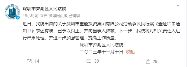 11月10日,深圳市罗湖区人民法院官方微博发布消息称:“近日,我院出具的关于深圳市宝能投资集团有限公司劳动争议执行案《查证结果通知书》表述有误,已予以纠正,并向当事人致歉。下一步,我院将对相关责任人进行严肃处理,并进一步加强管理,提高工作质量。”
