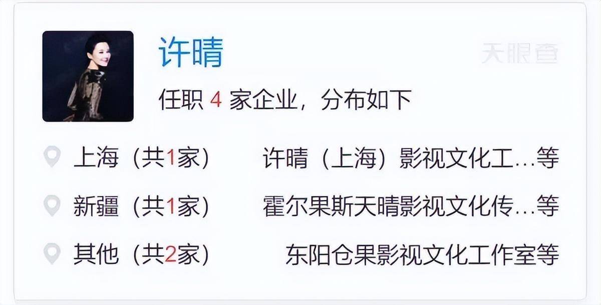 据天眼查APP,东阳仓果影视文化工作室成立于2017年8月,为许晴个人独资企业,经营范围含广播影视服务、著作权转让服务、影视策划服务、广告服务、造型和服装设计服务。目前,许晴名下共关联4家企业,除上述工作室外,其余3家已注销。