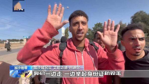 加沙城民众 艾哈迈德·巴迪尔:我们从以军士兵之间通过,我们一边走,一边举起身份证和双手,沿着右边走。以军用步枪指着我们,如果你向右或向左转,他们就会瞄准你。