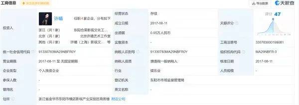 据天眼查APP,东阳仓果影视文化工作室成立于2017年8月,为许晴个人独资企业,经营范围含广播影视服务、著作权转让服务、影视策划服务、广告服务、造型和服装设计服务。目前,许晴名下共关联4家企业,除上述工作室外,其余3家已注销。
