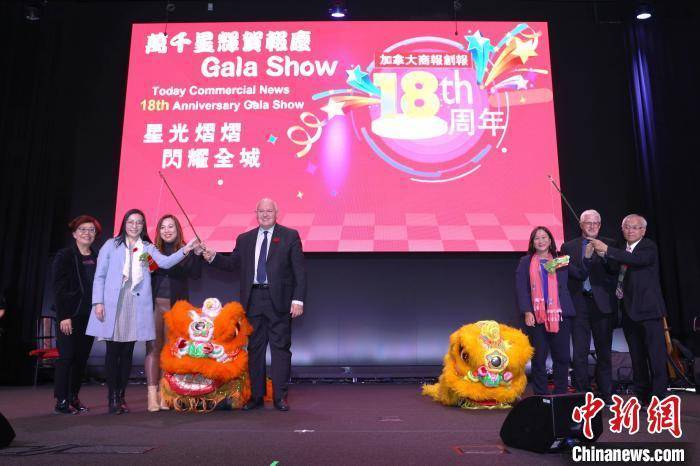 11月10日,《加拿大商报》在多伦多举办晚会,庆祝创刊18周年。图为该报社长门宗伟(右一)、总经理苏淑华(左一)与出席活动的政界嘉宾共同为醒狮点睛。 中新社记者 余瑞冬 摄