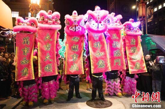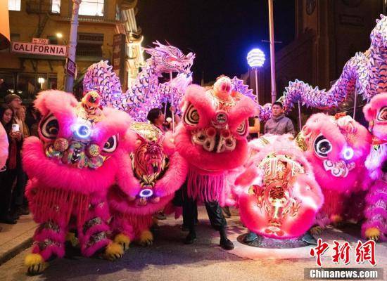 美国旧金山唐人街夜市上的舞龙舞狮表演吸引游客。中新社记者 刘关关 摄