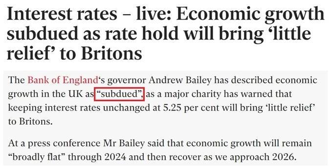 贝利同时强调,英国当前高达6.9%的高利率正在持续影响英国经济,预计未来英国经济增长“将必然处于低迷状态”。