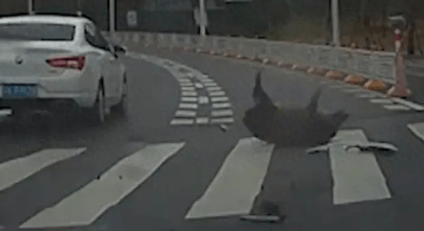 交警安全提示:遇到横穿马路的动物,应匀速刹车,保持在原车道内行驶;若不慎撞到动物,确保自身安全前提下第一时间报警处理。