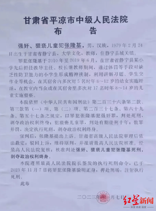 该布告还称,法院依照《中华人民共和国刑法》相关规定,以张某犯强奸罪,判处死刑,犯猥亵儿童罪,判处有期徒刑十年,数罪并罚,决定执行死刑。法院遵照最高人民法院院长签发的执行死刑命令,已于2023年11月7日将罪犯张某验明正身,押赴刑场,注射执行死刑。