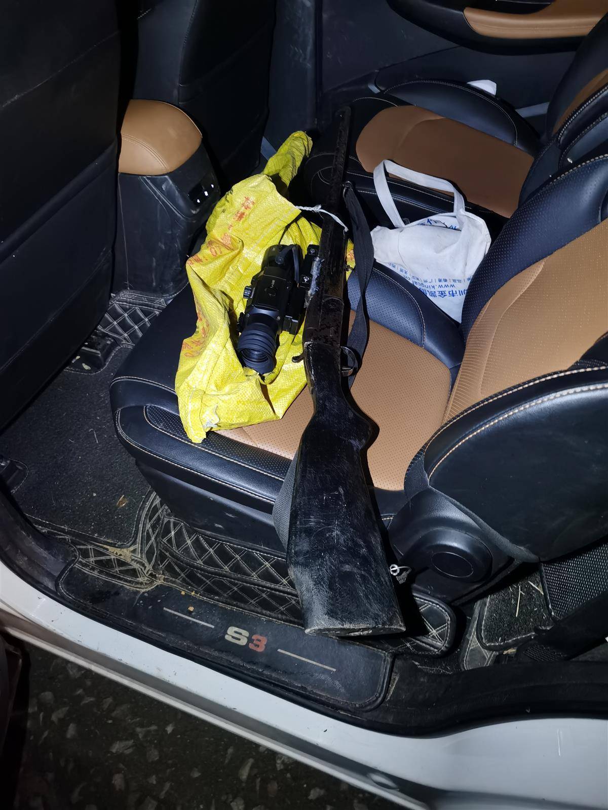 当民警对后排人员进行检查,使用手电对后窗玻璃照射时,赫然发现后座上竟有一截枪杆!民警当即将车辆上的3人进行控制,并对车辆和人员作进一步检查,发现除了这杆带有红外夜视瞄准器的“单管猎枪”外,还在该司机身上发现16号猎枪子弹11发。