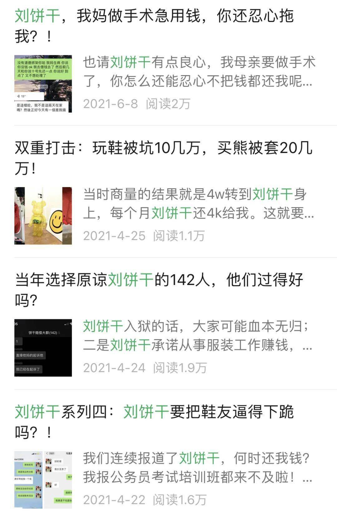 2019年大家发现被骗以后,140多人报案,后刘饼干被拘留,但是当年有几位被骗较多的所谓“鞋圈大哥”,一直极力让大家撤案,说留着刘饼干在外面赚钱,慢慢还大家,如果刘饼干被判了,大家就没有希望拿回欠款了,结果大家听信了这几位大哥的话,刘饼干拘留一个月以后出来了。