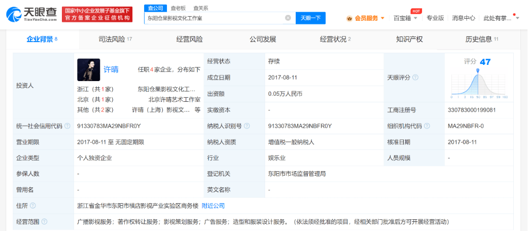 据天眼查APP,东阳仓果影视文化工作室成立于2017年8月,为许晴个人独资企业,经营范围含广播影视服务、著作权转让服务、影视策划服务、广告服务、造型和服装设计服务。目前,许晴名下共关联4家企业,除上述工作室外,其余3家已注销。