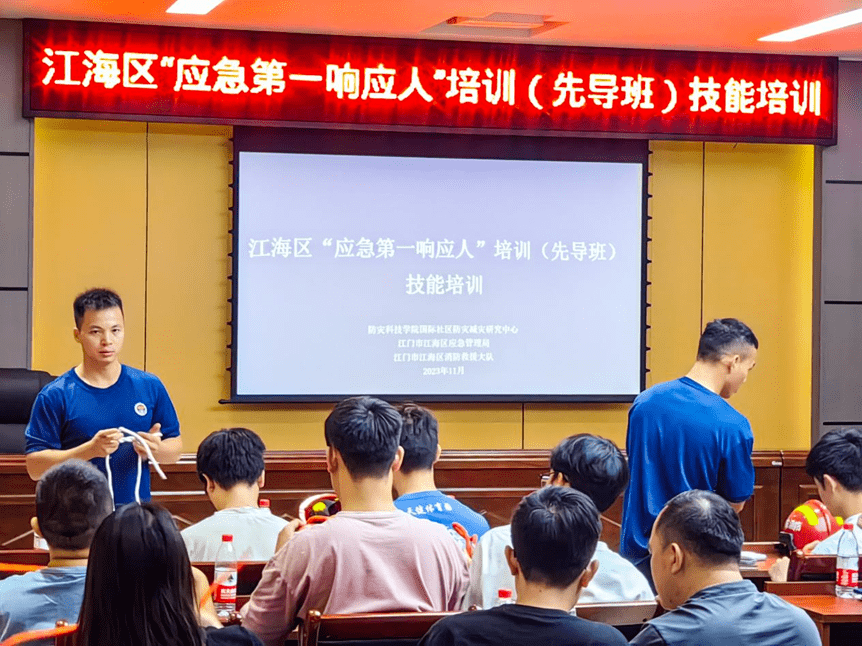 江海区也为响应人配备强大的师资团队,由防灾科技学院国际社区防灾减灾研究中心的专业师资负责培训,并邀请区消防救援大队的消防员担任助理教员,保证学员们学到实用技术、设备操作的技巧,以及收获有效的沟通协同能力和心理素质的提升,并通过接下来持续的进修,能迅速有效地响应城市中各种紧急情况。