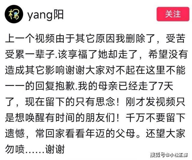 女子讲述自己的辛酸经历时,说妈妈已经安葬一个礼拜了,之所以会把这个视频发出来,主要是提醒大家,多多关心家里面的老人。