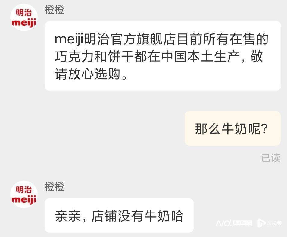 而淘宝平台的明治客服则表示,店内在售的巧克力和饼干都是在中国本土生产,并且店内并无销售牛奶产品。