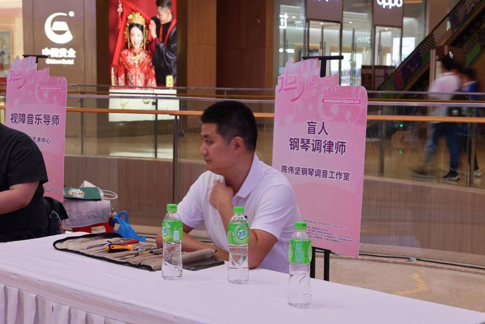 视障人士可以从事哪些工作?活动现场还邀请了多位不同行业的视障伙伴,除了大家熟悉的盲人按摩,还有咖啡师、茶饮师、音乐表演及培训、乐器调音、人工客服、手工制作、网络主播、社工,等等。视障咖啡师、茶饮师的摊位前吸引着品尝饮品的人流,视障网络主播的生动解说让不少路人停下脚步……