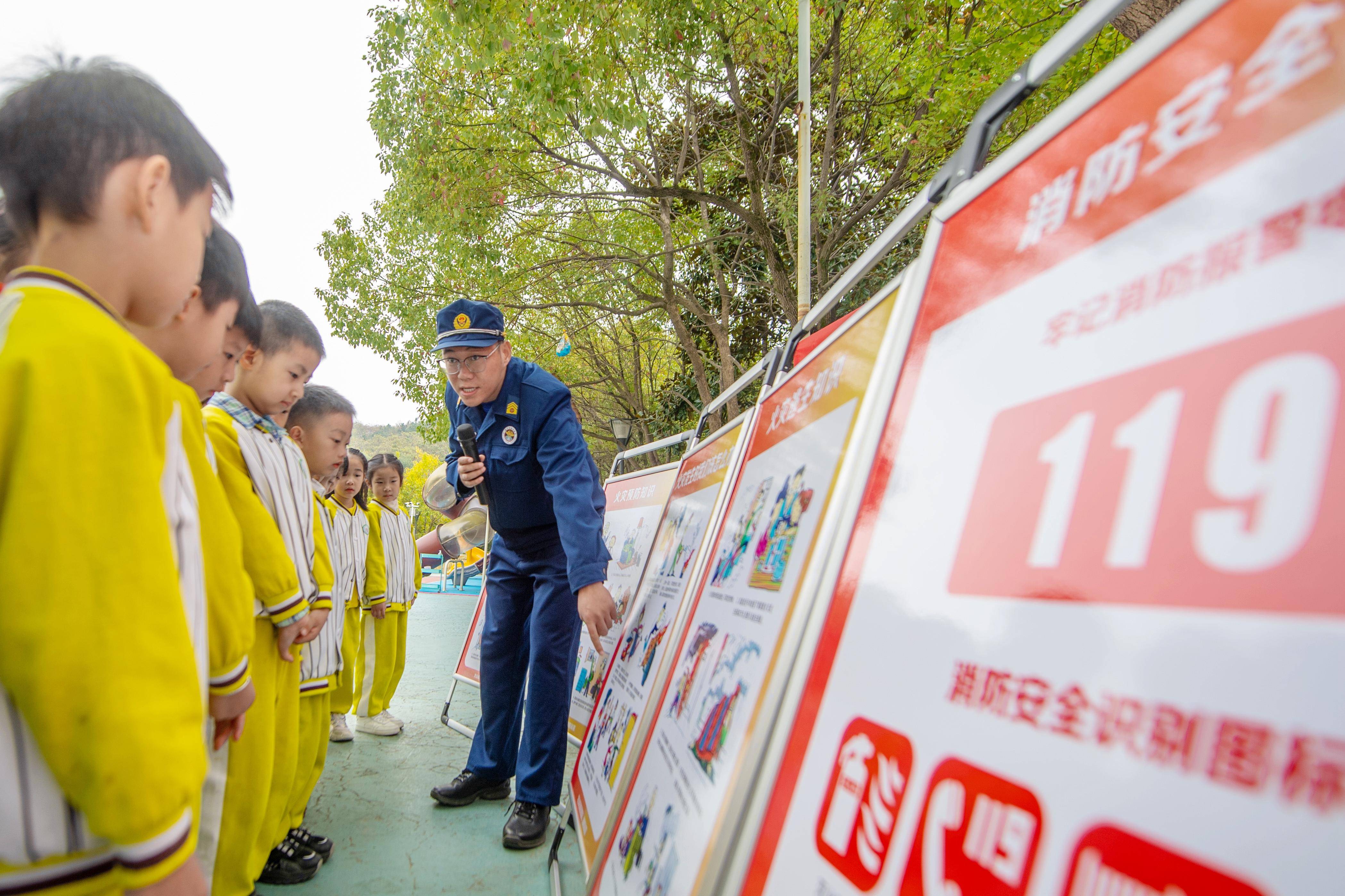 11月9日,在浙江省湖州市长兴县龙山幼儿园,龙山街道消防站消防员向小朋友讲解消防安全知识。 新华社发(谭云俸 摄)