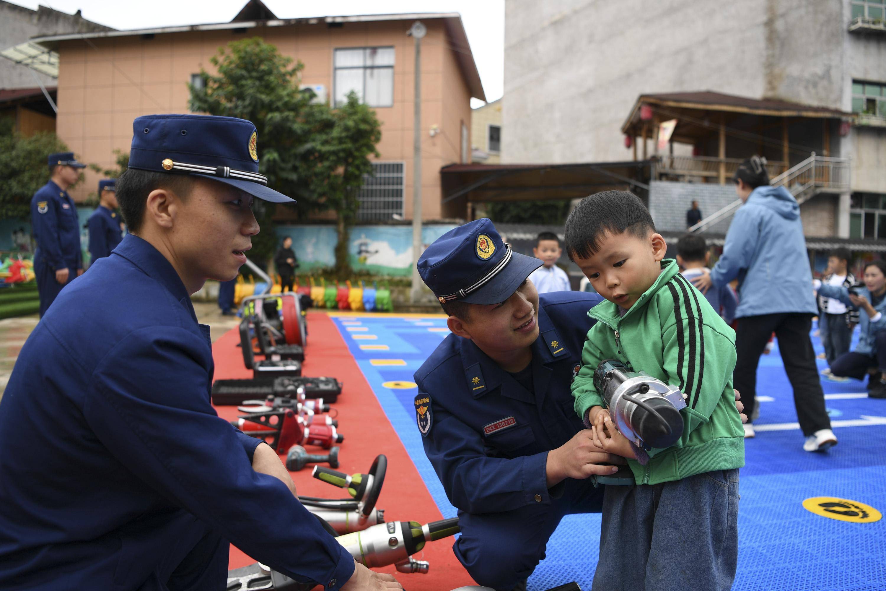 11月9日,在贵州省遵义市余庆县白泥镇下里幼儿园,小朋友体验使用消防救援器材。 新华社发(贺春雨 摄)