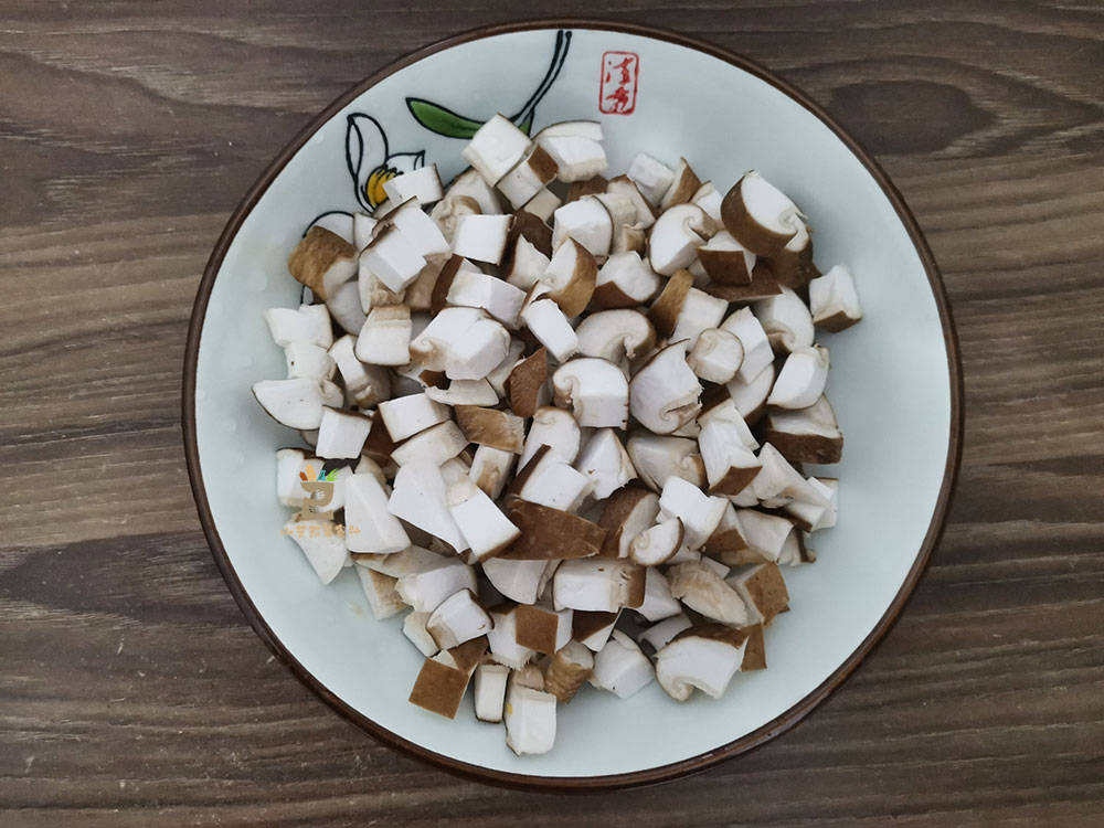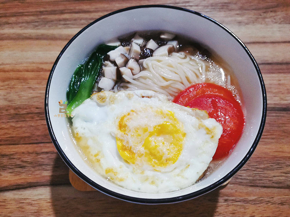 1、新鲜的香菇,掰掉根部,搓洗干净之后,切成小丁,盛放到盘子里边。另外准备一些配菜,绿叶菜,西红柿,荷包蛋,以及增香调味的葱花。
