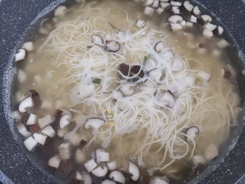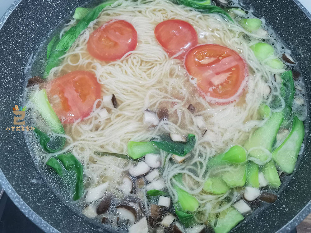 3、在锅中加入宽水,然后大火烧开,把面放进去,搅拌几下,盖盖煮三分钟左右,直到把面条煮熟。