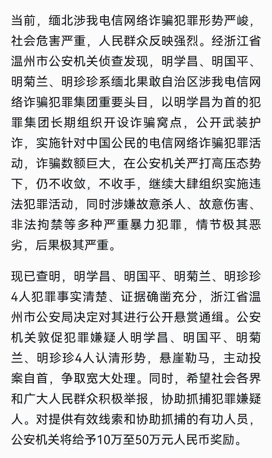 11月12日,据公安部刑侦局消息,公安机关公开通缉缅北果敢自治区电信网络诈骗犯罪集团重要头目明学昌、明国平、明菊兰、明珍珍。对提供有效线索和协助抓捕的有功人员,公安机关将给予10万至50万元人民币奖励。