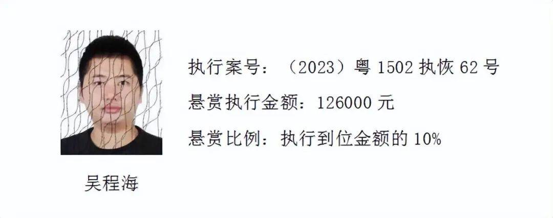 为充分利用社会力量查找被执行人财产,切实保护债权人的合法权益,促进社会信用机制的建立,现根据申请执行人的申请,依据《最高人民法院关于依法制裁规避执行执行的若干意见》第五条、《广东省高级人民法院关于在执行工作中实行悬赏执行的意见(试行)》的有关规定,决定对本院执行的(2023)粤1502执恢62号案件的被执行人吴程海予以悬赏执行。面向全社会查找被执行人的下落,特发布此悬赏公告。