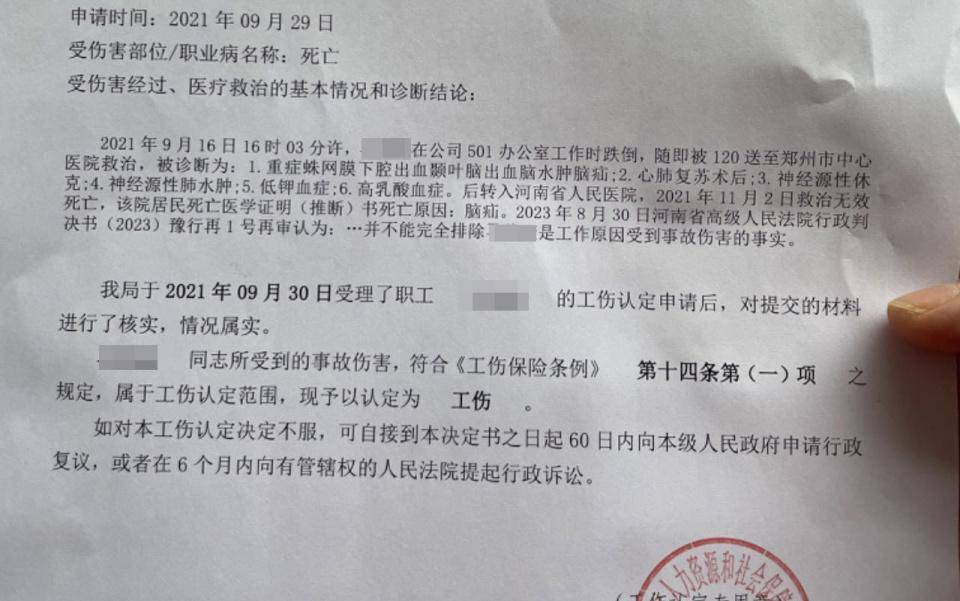 历经两年诉讼,在办公室内倒地昏迷、抢救多日无效死亡的龚明(化名),被郑州市中原区人社局认定为工伤。