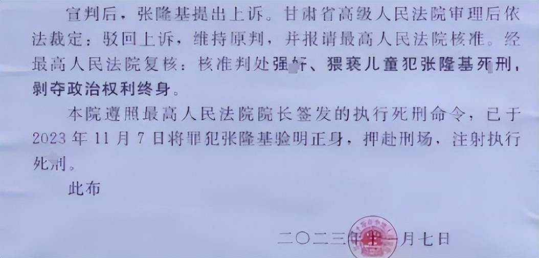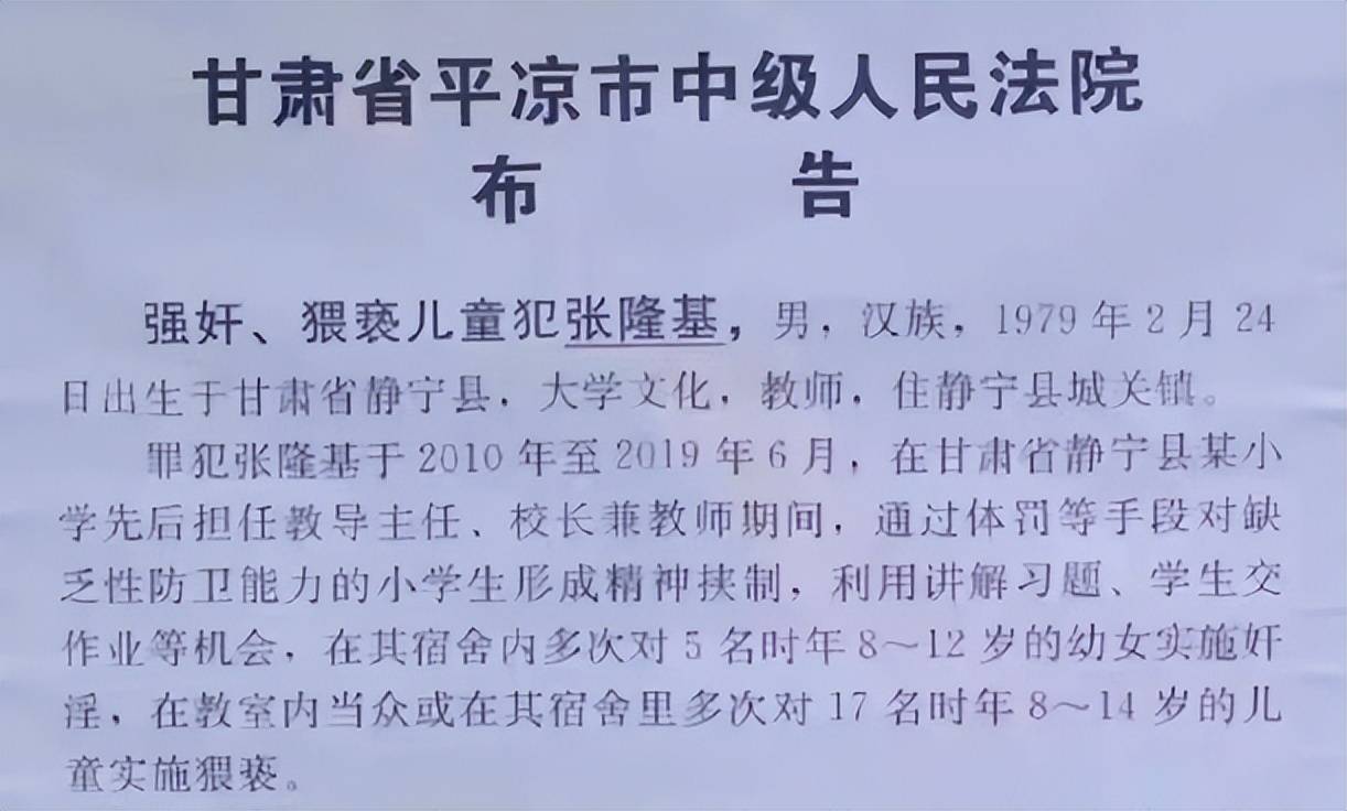 我们这次终于等来了我们想要的,甘肃省平凉市中院的布告让我们看到了,在该市静宁县某小学校长张隆基曾强暴并当众猥亵多名学生,已经于11月7日被执行死刑。