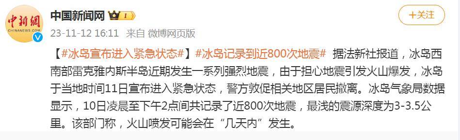 据法新社报道,冰岛西南部雷克雅内斯半岛近期发生一系列强烈地震,由于担心地震引发火山爆发,冰岛于当地时间11日宣布进入紧急状态,警方敦促相关地区居民撤离。冰岛气象局数据显示,10日凌晨至下午2点间共记录了近800次地震,最浅的震源深度为3-3.5公里。该部门称,火山喷发可能会在“几天内”发生。