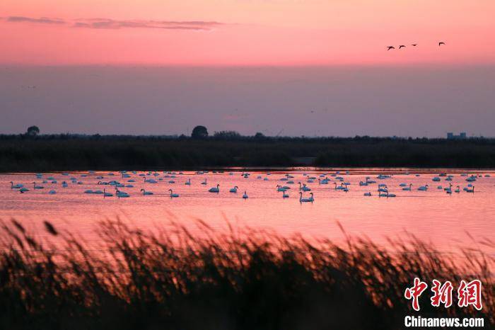 11月11日,夕阳西下,一群天鹅正在黄河口湿地栖息觅食。记者 梁犇 摄