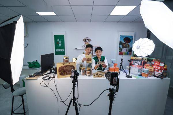 ↑11月12日,浙江省诸暨市东白湖镇上英村党总支书记赵坚均、党员志愿者庄园(右)在“上英园梦”共富工坊直播间销售香榧。