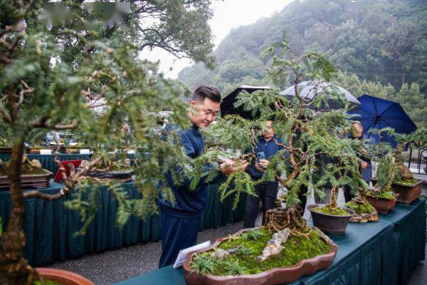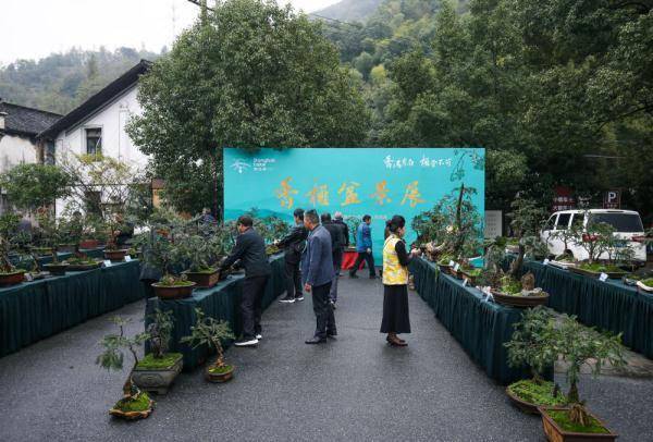 ↑11月11日,在浙江省诸暨市东白湖镇,香榧盆景爱好者、游客参观香榧盆景展。