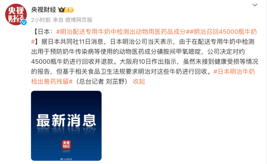 据央视财经援引日本共同社11月11日报道,日本著名乳业品牌明治牛奶因产品中检出兽药残留,宣布召回约4.5万瓶已上市的瓶装牛奶。