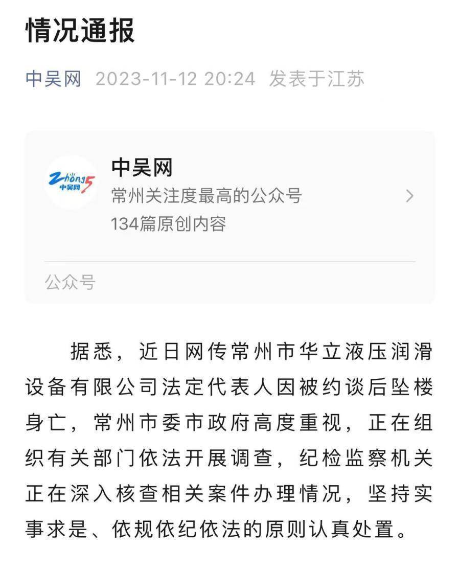 据悉,近日网传常州市华立液压润滑设备有限公司法定代表人因被约谈后坠楼身亡,常州市委市政府高度重视,正在组织有关部门依法开展调查,纪检监察机关正在深入核查相关案件办理情况,坚持实事求是、依规依纪依法的原则认真处置。