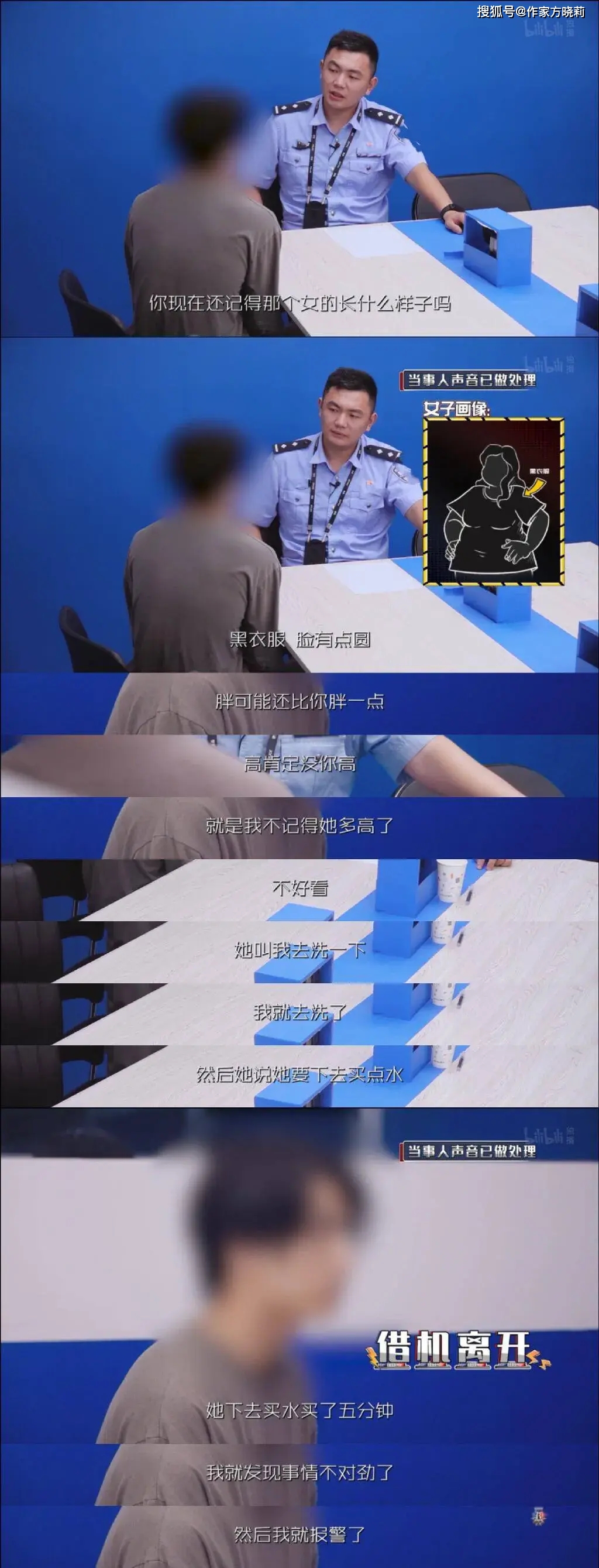 “她叫我洗一下。我就洗了。然后她说她要下去买点水。她下去买水买了五分钟。我就发现事情不对劲了。然后我就报警了。”