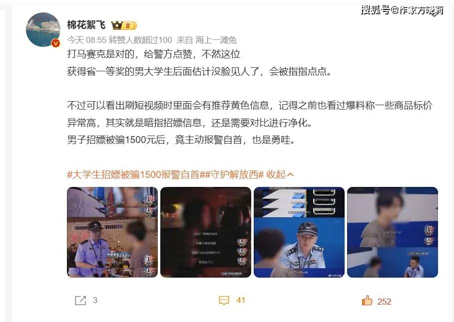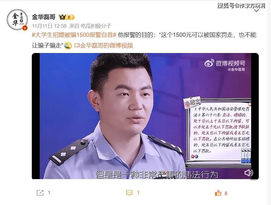 昨天在热搜看到一则新闻:湖南长沙某男大学生招嫖,结果被骗了1500元,遂报警。期间,欧阳朝晖老师(天心公安分局,坡子街派出所警官)与他的同事去执行任务,他说道:“我说你是第一个打电话报警,说你自己招嫖,被骗钱,然后主动联系我们派出所,想要对你进行处罚的人。”,听起来是不是不可思议?