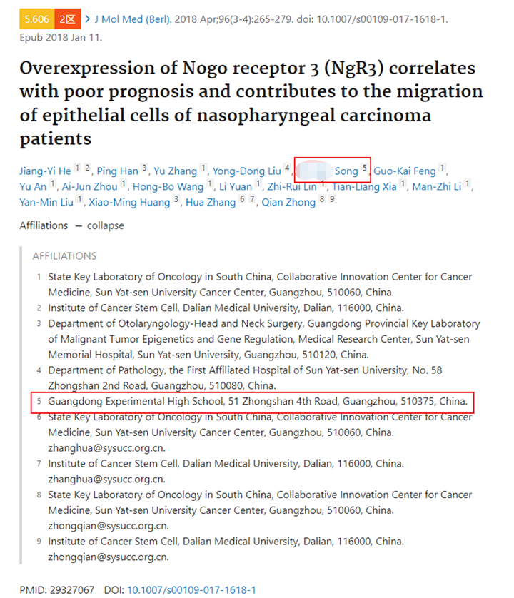 2018年 中科院2区 单位为广东省实验高中