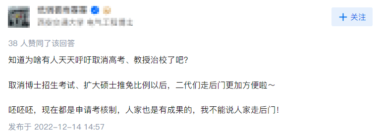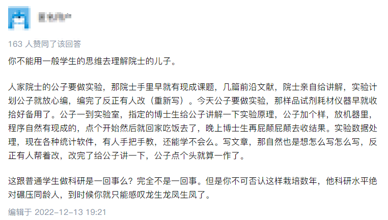 有一些网友也抱有不同的想法,认为大多数抨击其学术不端的人不能用一般学生的视角去看待院士的孩子,那部分人只想发泄情绪,不管真相,他们会说院士培养自己的孩子就是错的,就是不公平,就是学阀。