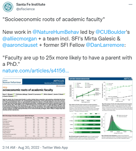在这篇名为《Socioeconomic roots of academic faculty(学术教师的社会经济根源)》的论文中,研究人员调查了7204名美国大学终身教授,统计了他们童年时期父母的社会经济地位(SES)和父母最高教育水平等信息,并与同一时期的一般人口模式进行对比。