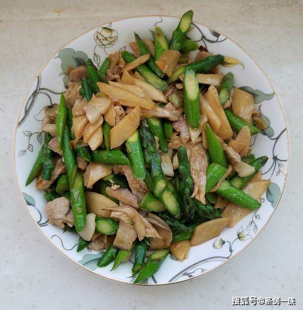 4、接着放入芦笋、草菇,加入蚝油,盐、鸡精,继续翻炒片刻即可出锅。
