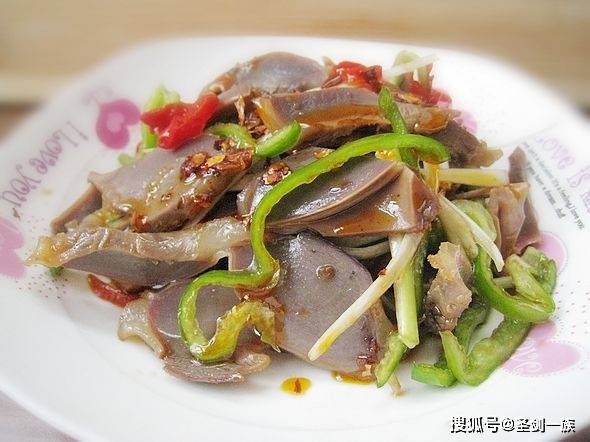 ①鸭胗切薄片,用盐、料酒腌制片刻。