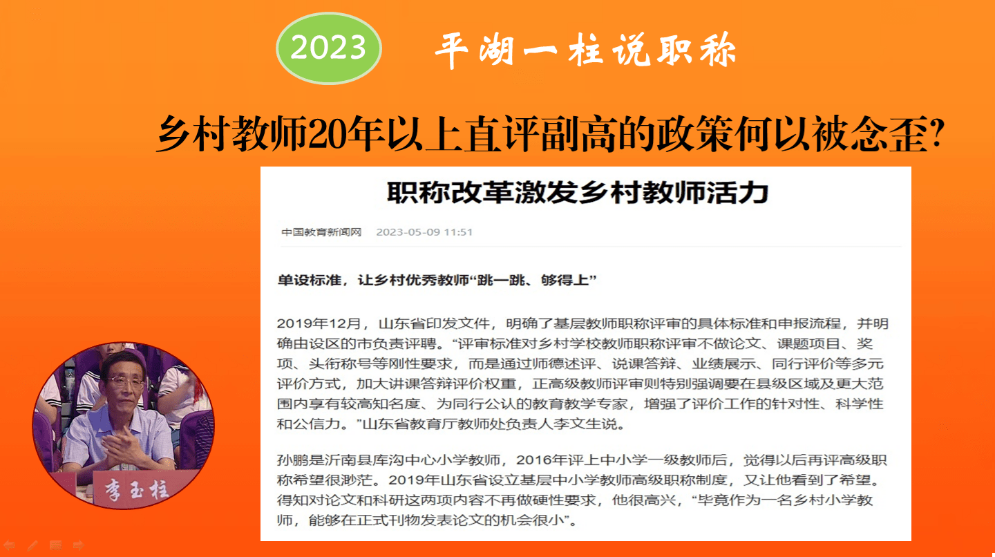 也正因为如此,省里才继出台农村“直评”政策后,又出台了“基层高级教师”政策,适当降低了高级标准,让农村教师踮踮脚尖能够得着。这个政策实施以来,让广大农村教师得到了实惠,深受欢迎,中国教育报为此还做了过专门题 为“职称改革激发乡村教师活力”的报道。职称评审“对乡村学校教师职称评审不做论文、课题项目、奖项、头衔称号等刚性要求。”
