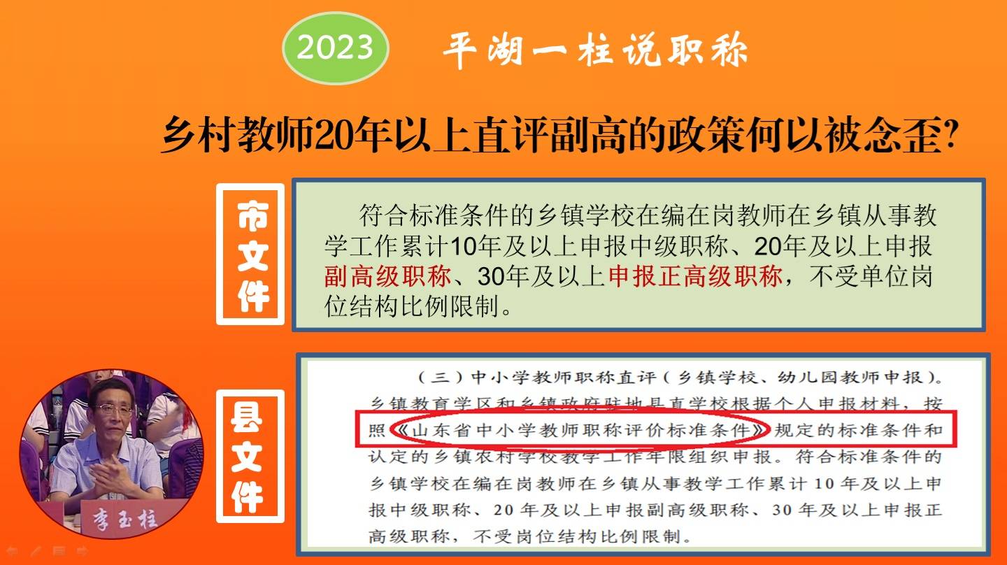 可是,到了县区,政策成了这样的:“乡镇教育学区和乡镇政府驻地县直学校根据个人申报材料,按照《山东省中小学教师职称评价标准条件》规定的标准条件和认定的乡镇农村学校教学工作年限组织申报。”