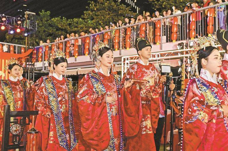 深圳特区报讯(记者 许依妍 文/图)市集活动张灯结彩、鼓乐齐鸣,新人们身着汉服,遵传统礼制,行婚典之仪,沉浸式体验“合卺”“结发”“执手”“三书六礼”等婚俗……昨日,在福田区婚姻登记点门口的香蜜公园编织广场上,“福甜囍市”婚姻主题市集正在举办,一场传统汉服集体婚礼令人耳目一新。不少新人领证后,顺路就来到市集里看看餐饮酒店、婚纱婚车。当天,活动现场还有婚姻辅导、商家展示、公益慈善等活动。据统计,福田婚姻登记处当天办理298宗婚姻登记业务,达到今年以来最高峰。