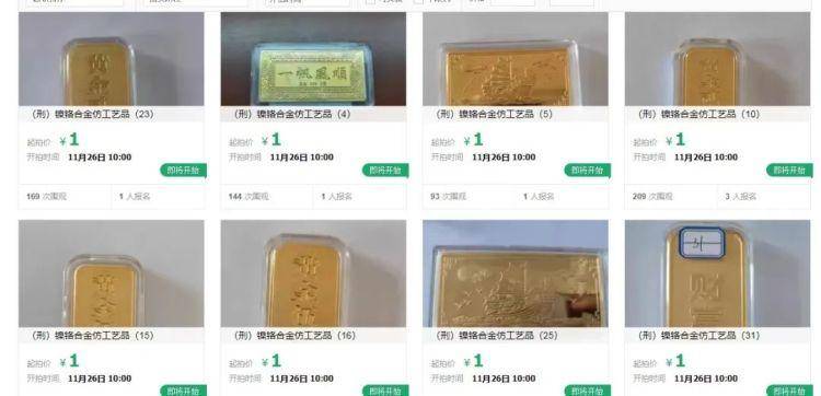 李文静说,在第二次上拍这些法拍标的时,她特意标明这些法拍标的是“镍铬合金仿工艺品”。起拍价仍然是1元,保证金已经降到20元。“希望竞拍者谨慎竞买,别再‘按图买黄金’了。”