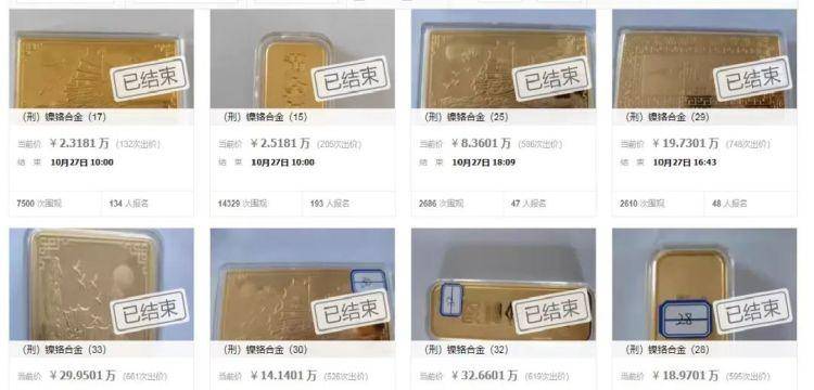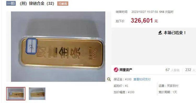 中宁县法院对这些“财富金条”进行鉴定,确认它们是镍铬合金。为了处置这些涉案罚没物,中宁县法院对其进行司法拍卖。10月26日,这些镍铬合金块上拍后,出现疯狂竞买。“标注为1块钱的东西,有人竟然出价到32万多元,我特别奇怪,这人难道是家里有矿?”李文静说。