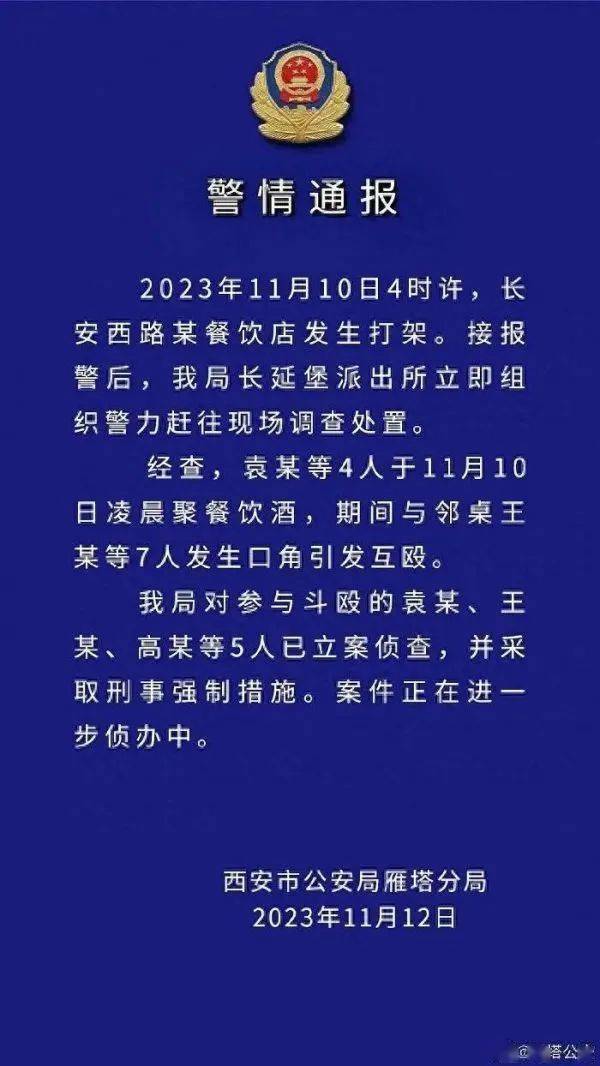2023年11月10日4时许,长安西路某餐饮店发生打架。接报警后,我局长延堡派出所立即组织警力赶往现场调查处置。 经查,袁某等4人于11月10日凌晨聚餐饮酒,期间与邻桌王某等7人发生口角引发互殴。我局对参与斗殴的袁某、王某、高某等5人已立案侦查, 并采取刑事强制措施。 案件正在进一步侦办中。