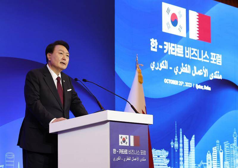 10月25日,韩国总统尹锡悦在卡塔尔多哈一家酒店举行的韩国与卡塔尔商务论坛上讲话(视觉中国)