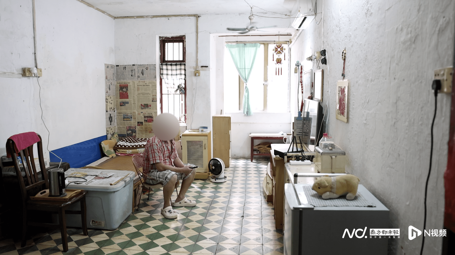 一个明亮的单间,这是温叔日常生活的房间。天花板上旋转的吊扇和放在角落里的木衣柜都极具年代感。
