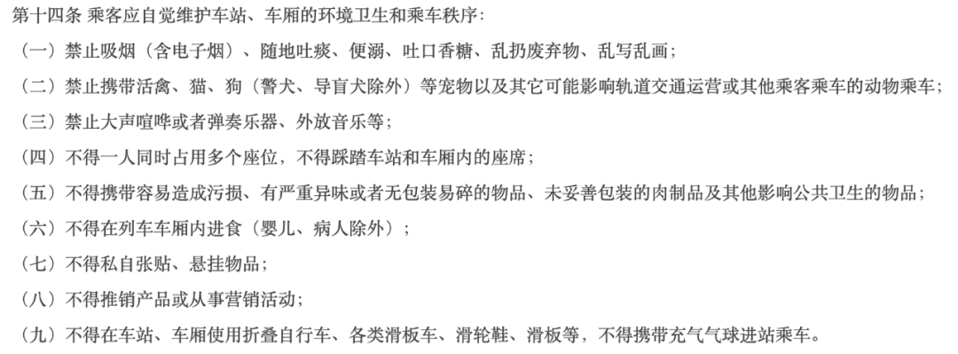 根据《北京市轨道交通乘客守则》第十四条,乘客应自觉维护车站、车厢的环境卫生和乘车秩序,禁止携带活禽、猫、狗(警犬、导盲犬除外)等宠物以及其它可能影响轨道交通运营或其他乘客乘车的动物乘车。