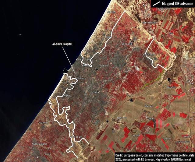 10月30日开始,以色列军队兵分四路,分别从加沙城西北、东北和加沙中部以及加沙南部发动进攻(以军对加沙南部汗尤尼斯地区实施小规模佯攻),至11月12日上午,以军已经将加沙城城郊四面全部围住,包括加沙城西侧所有沿海街道和居民点已经全部都在以军地面部队的控制之下,以色列军队为了防止加沙城南部和北部的哈马斯武装人员组织游击战,特意在加沙中部地区从东至西挖掘了一条长11公里,宽2公里的巨型壕沟群,以此来隔离并杜绝哈马斯武装人员通过地道来伏击以色列国防军的地面部队。