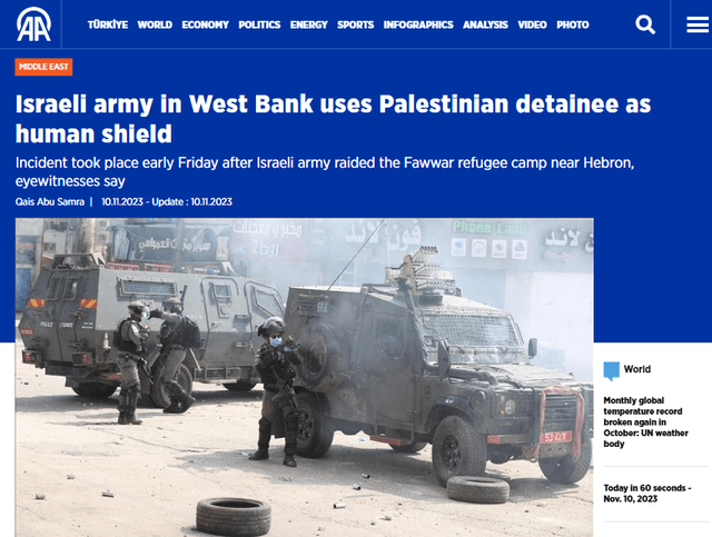 11月10日,土耳其阿纳多卢通讯社曝光了一条以军在约旦河西岸的战斗视频,显示在某个街道,一名巴勒斯坦男子被蒙住双眼,跪坐在地上,至少一名持枪的以军士兵躲在他身后。同样报道和这个视频的半岛电视台透露,这名被以军士兵当成“人肉盾牌”的巴勒斯坦人叫阿布·哈什哈什,拍摄于11月10日上午,地点是在约旦河西岸城市希伯伦附近的法瓦尔难民营。