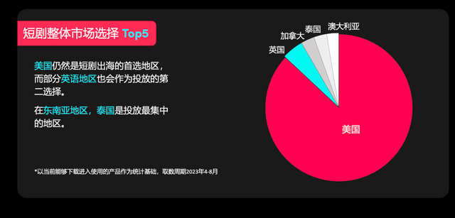 目前短剧在海外的主要消费地区,一个是欧美澳,另一个是东南亚。TikTok发布的《TikTok短剧出海营销策略》报告中也提到,短剧整体市场选择Top5中,美国是短剧出海的首选地区,在东南亚市场,泰国是投放最集中的地区。
